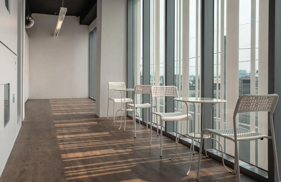Meja kerja, area tempat duduk dan pengatur suhu disediakan.